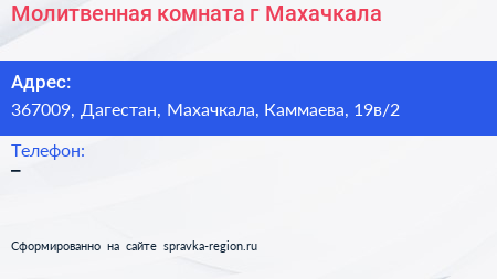 Молитвенная комната, г. Махачкала по адресу 367009, Дагестан, Махачкала, Каммаева, 19в/2 в дальнейшем Организация, размещена в следующих категориях: