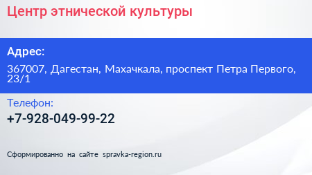 Центр этнической культуры по адресу 367007, Дагестан, Махачкала, проспект Петра Первого, 23/1 в дальнейшем Организация, размещена в следующих категориях:
