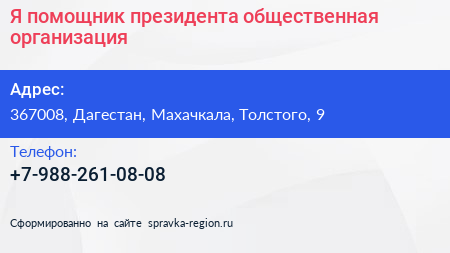 Я помощник президента, общественная организация по адресу 367008, Дагестан, Махачкала, Толстого, 9 в дальнейшем Организация, размещена в следующих категориях:
