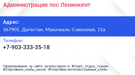 Администрация пос. Ленинкент по адресу 367901, Дагестан, Махачкала, Совхозная, 11а в дальнейшем Организация, размещена в следующих категориях: