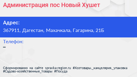 Администрация пос. Новый Хушет по адресу 367911, Дагестан, Махачкала, Гагарина, 21Б в дальнейшем Организация, размещена в следующих категориях: