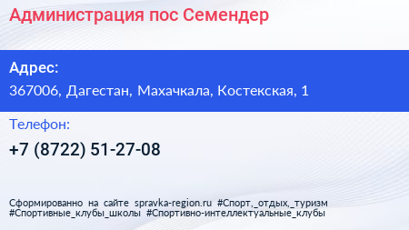Администрация пос. Семендер по адресу 367006, Дагестан, Махачкала, Костекская, 1 в дальнейшем Организация, размещена в следующих категориях: