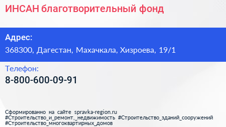ИНСАН, благотворительный фонд по адресу 368300, Дагестан, Махачкала, Хизроева, 19/1 в дальнейшем Организация, размещена в следующих категориях: