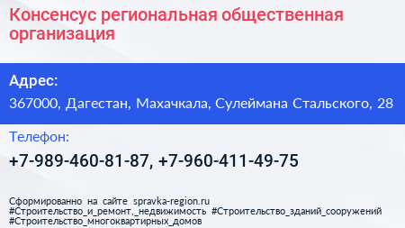 Консенсус, региональная общественная организация по адресу 367000, Дагестан, Махачкала, Сулеймана Стальского, 28 в дальнейшем Организация, размещена в следующих категориях: