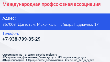 Международная профсоюзная ассоциация по адресу 367008, Дагестан, Махачкала, Гайдара Гаджиева, 17 в дальнейшем Организация, размещена в следующих категориях:
