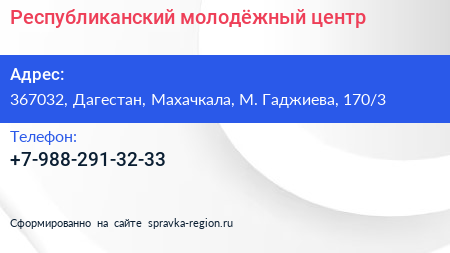 Республиканский молодёжный центр по адресу 367032, Дагестан, Махачкала, М. Гаджиева, 170/3 в дальнейшем Организация, размещена в следующих категориях: