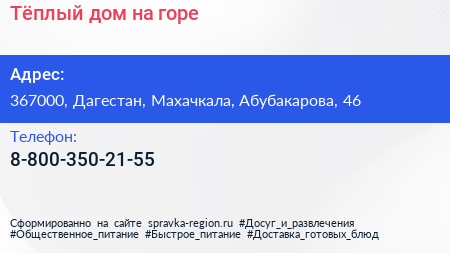 Тёплый дом на горе по адресу 367000, Дагестан, Махачкала, Абубакарова, 46 в дальнейшем Организация, размещена в следующих категориях: