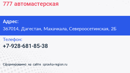 777, автомастерская по адресу 367014, Дагестан, Махачкала, Североосетинская, 2Б в дальнейшем Организация, размещена в следующих категориях: