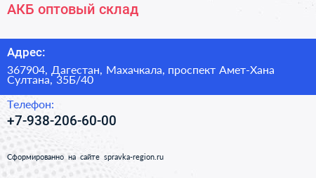 АКБ, оптовый склад по адресу 367904, Дагестан, Махачкала, проспект Амет-Хана Султана, 35Б/40 в дальнейшем Организация, размещена в следующих категориях: