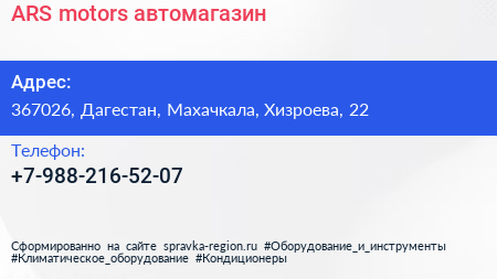ARS motors, автомагазин по адресу 367026, Дагестан, Махачкала, Хизроева, 22 в дальнейшем Организация, размещена в следующих категориях: