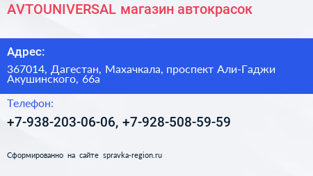 AVTOUNIVERSAL, магазин автокрасок по адресу 367014, Дагестан, Махачкала, проспект Али-Гаджи Акушинского, 66а в дальнейшем Организация, размещена в следующих категориях: