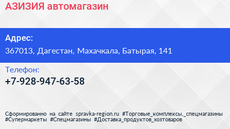 АЗИЗИЯ, автомагазин по адресу 367013, Дагестан, Махачкала, Батырая, 141 в дальнейшем Организация, размещена в следующих категориях: