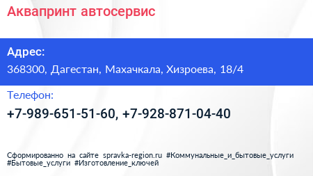 Аквапринт, автосервис по адресу 368300, Дагестан, Махачкала, Хизроева, 18/4 в дальнейшем Организация, размещена в следующих категориях: