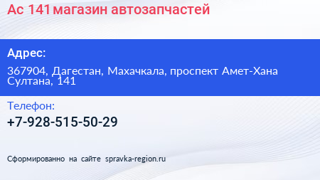 Ас 141, магазин автозапчастей по адресу 367904, Дагестан, Махачкала, проспект Амет-Хана Султана, 141 в дальнейшем Организация, размещена в следующих категориях: