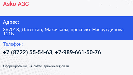 Asko, АЗС по адресу 367018, Дагестан, Махачкала, проспект Насрутдинова, 111Б в дальнейшем Организация, размещена в следующих категориях: