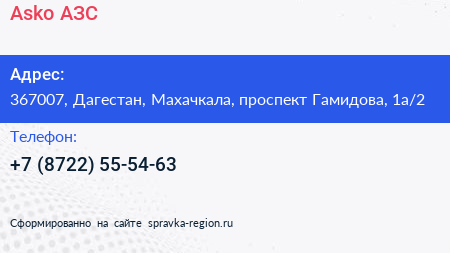 Asko, АЗС по адресу 367007, Дагестан, Махачкала, проспект Гамидова, 1а/2 в дальнейшем Организация, размещена в следующих категориях: