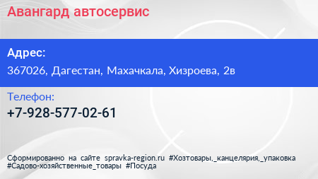 Авангард, автосервис по адресу 367026, Дагестан, Махачкала, Хизроева, 2в в дальнейшем Организация, размещена в следующих категориях:
