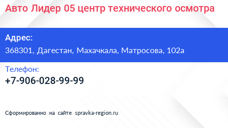 Авто Лидер 05, центр технического осмотра по адресу 368301, Дагестан, Махачкала, Матросова, 102а в дальнейшем Организация, размещена в следующих категориях: