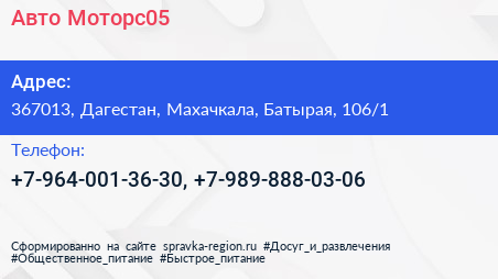 Авто Моторс05 по адресу 367013, Дагестан, Махачкала, Батырая, 106/1 в дальнейшем Организация, размещена в следующих категориях:
