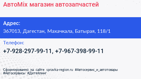 АвтоMix, магазин автозапчастей по адресу 367013, Дагестан, Махачкала, Батырая, 118/1 в дальнейшем Организация, размещена в следующих категориях: