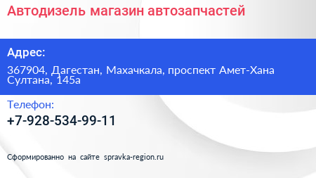 Автодизель, магазин автозапчастей по адресу 367904, Дагестан, Махачкала, проспект Амет-Хана Султана, 145а в дальнейшем Организация, размещена в следующих категориях: