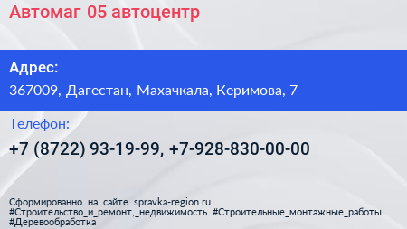 Автомаг 05, автоцентр по адресу 367009, Дагестан, Махачкала, Керимова, 7 в дальнейшем Организация, размещена в следующих категориях: