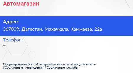 Автомагазин по адресу 367009, Дагестан, Махачкала, Каммаева, 22а в дальнейшем Организация, размещена в следующих категориях: