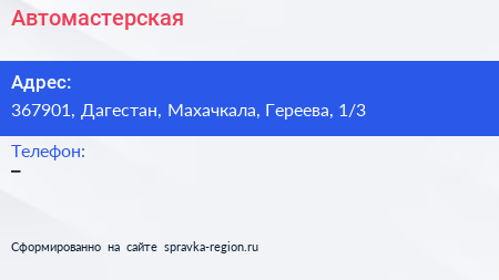 Автомастерская по адресу 367901, Дагестан, Махачкала, Гереева, 1/3 в дальнейшем Организация, размещена в следующих категориях: