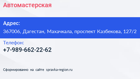 Автомастерская по адресу 367006, Дагестан, Махачкала, проспект Казбекова, 127/2 в дальнейшем Организация, размещена в следующих категориях: