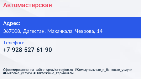 Автомастерская по адресу 367008, Дагестан, Махачкала, Чеэрова, 14 в дальнейшем Организация, размещена в следующих категориях: