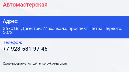 Автомастерская по адресу 367018, Дагестан, Махачкала, проспект Петра Первого, 50/2 в дальнейшем Организация, размещена в следующих категориях: