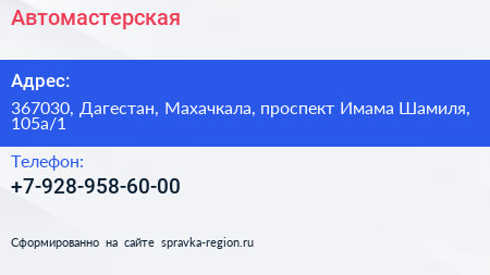 Автомастерская по адресу 367030, Дагестан, Махачкала, проспект Имама Шамиля, 105а/1 в дальнейшем Организация, размещена в следующих категориях: