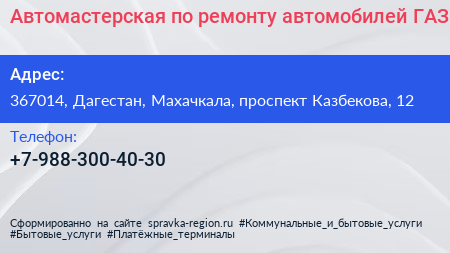 Автомастерская по ремонту автомобилей ГАЗ по адресу 367014, Дагестан, Махачкала, проспект Казбекова, 12 в дальнейшем Организация, размещена в следующих категориях: