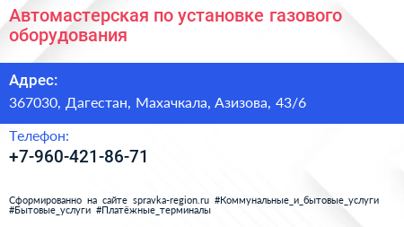 Автомастерская по установке газового оборудования по адресу 367030, Дагестан, Махачкала, Азизова, 43/6 в дальнейшем Организация, размещена в следующих категориях: