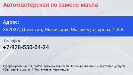 Автомастерская по замене масла по адресу 367027, Дагестан, Махачкала, Магомедтагирова, 155Б в дальнейшем Организация, размещена в следующих категориях: