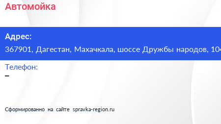 Автомойка по адресу 367901, Дагестан, Махачкала, шоссе Дружбы народов, 104 в дальнейшем Организация, размещена в следующих категориях: