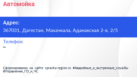 Автомойка по адресу 367031, Дагестан, Махачкала, Аданакская 2-я, 2/5 в дальнейшем Организация, размещена в следующих категориях:
