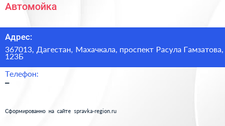 Автомойка по адресу 367013, Дагестан, Махачкала, проспект Расула Гамзатова, 123Б в дальнейшем Организация, размещена в следующих категориях: