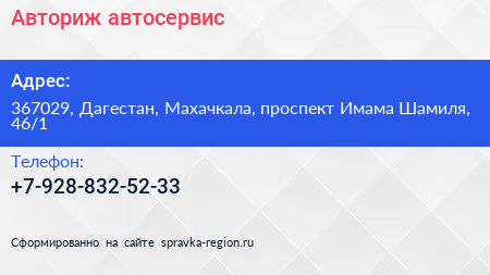 Авториж, автосервис по адресу 367029, Дагестан, Махачкала, проспект Имама Шамиля, 46/1 в дальнейшем Организация, размещена в следующих категориях: