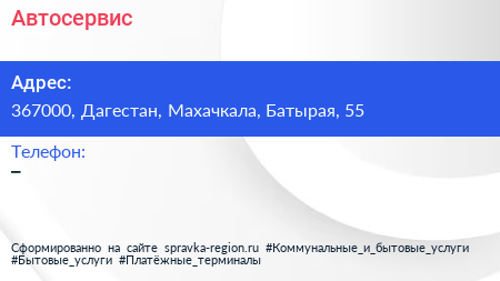 Автосервис по адресу 367000, Дагестан, Махачкала, Батырая, 55 в дальнейшем Организация, размещена в следующих категориях:
