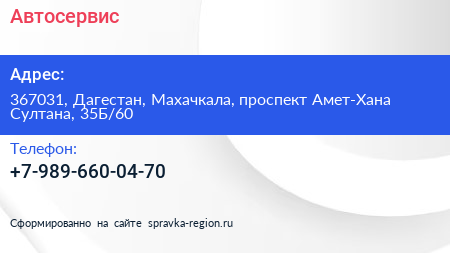 Автосервис по адресу 367031, Дагестан, Махачкала, проспект Амет-Хана Султана, 35Б/60 в дальнейшем Организация, размещена в следующих категориях: