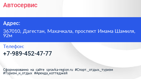 Автосервис по адресу 367010, Дагестан, Махачкала, проспект Имама Шамиля, 92м в дальнейшем Организация, размещена в следующих категориях: