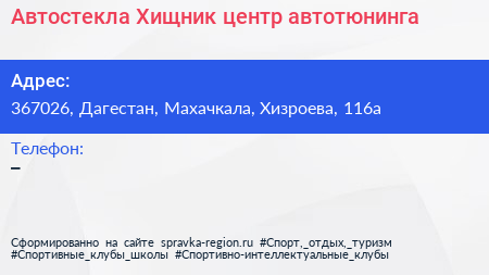 Автостекла-Хищник, центр автотюнинга по адресу 367026, Дагестан, Махачкала, Хизроева, 116а в дальнейшем Организация, размещена в следующих категориях: