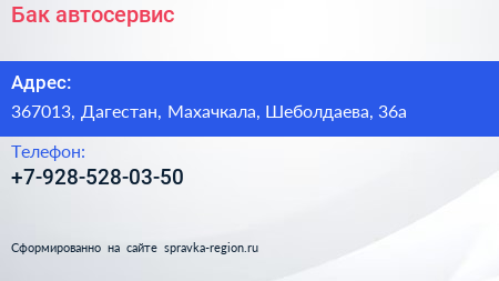 Бак, автосервис по адресу 367013, Дагестан, Махачкала, Шеболдаева, 36а в дальнейшем Организация, размещена в следующих категориях: