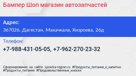 Бампер Шоп, магазин автозапчастей по адресу 367026, Дагестан, Махачкала, Хизроева, 26д в дальнейшем Организация, размещена в следующих категориях: