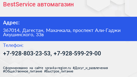 BestService, автомагазин по адресу 367014, Дагестан, Махачкала, проспект Али-Гаджи Акушинского, 33в в дальнейшем Организация, размещена в следующих категориях: