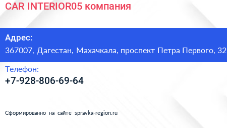 CAR INTERIOR05, компания по адресу 367007, Дагестан, Махачкала, проспект Петра Первого, 32 в дальнейшем Организация, размещена в следующих категориях: