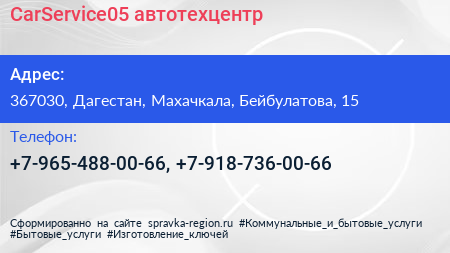 CarService05, автотехцентр по адресу 367030, Дагестан, Махачкала, Бейбулатова, 15 в дальнейшем Организация, размещена в следующих категориях: