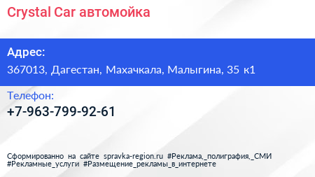 Crystal Car, автомойка по адресу 367013, Дагестан, Махачкала, Малыгина, 35 к1 в дальнейшем Организация, размещена в следующих категориях: