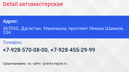 Detail, автомастерская по адресу 367010, Дагестан, Махачкала, проспект Имама Шамиля, 124 в дальнейшем Организация, размещена в следующих категориях:
